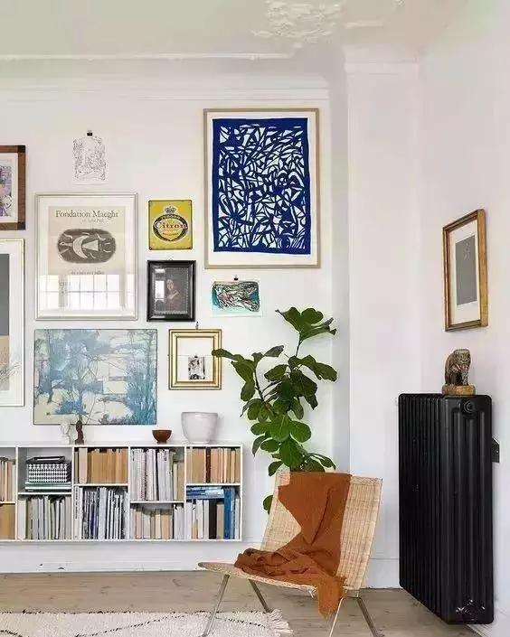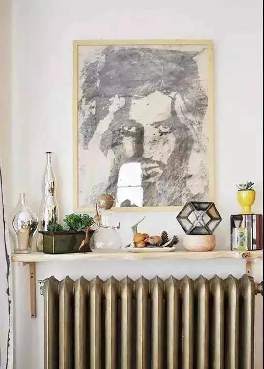 ▲墻面釘上一層隔板擺放新奇小物件,再來一幅掛畫,陳舊的暖氣片還正好有點復古味道。